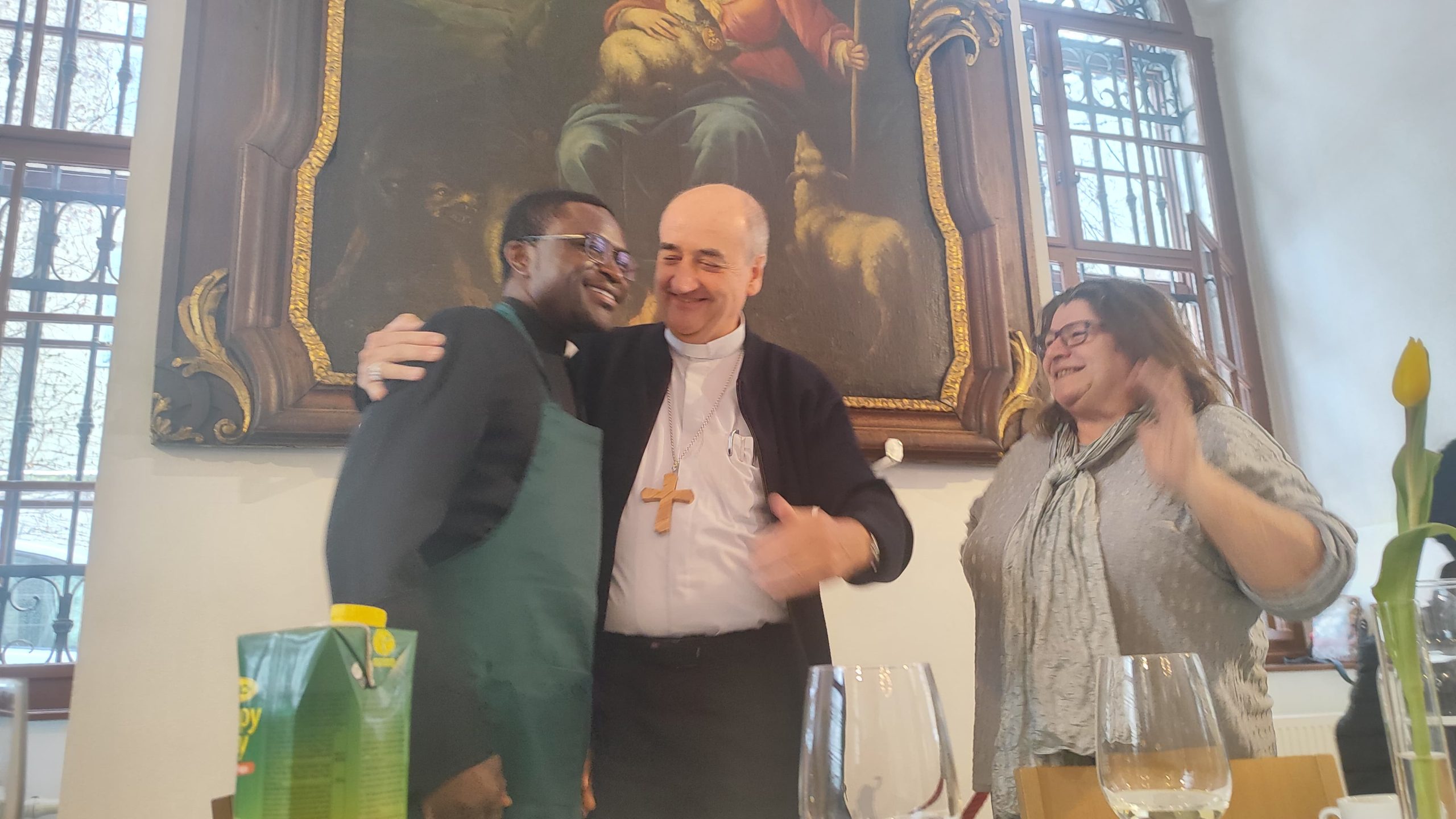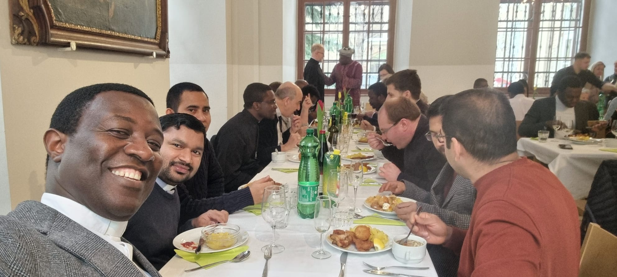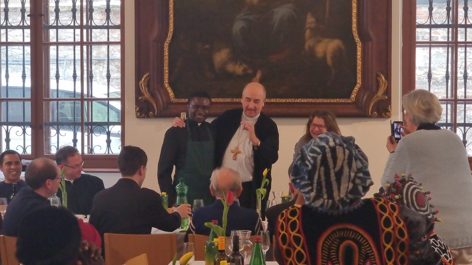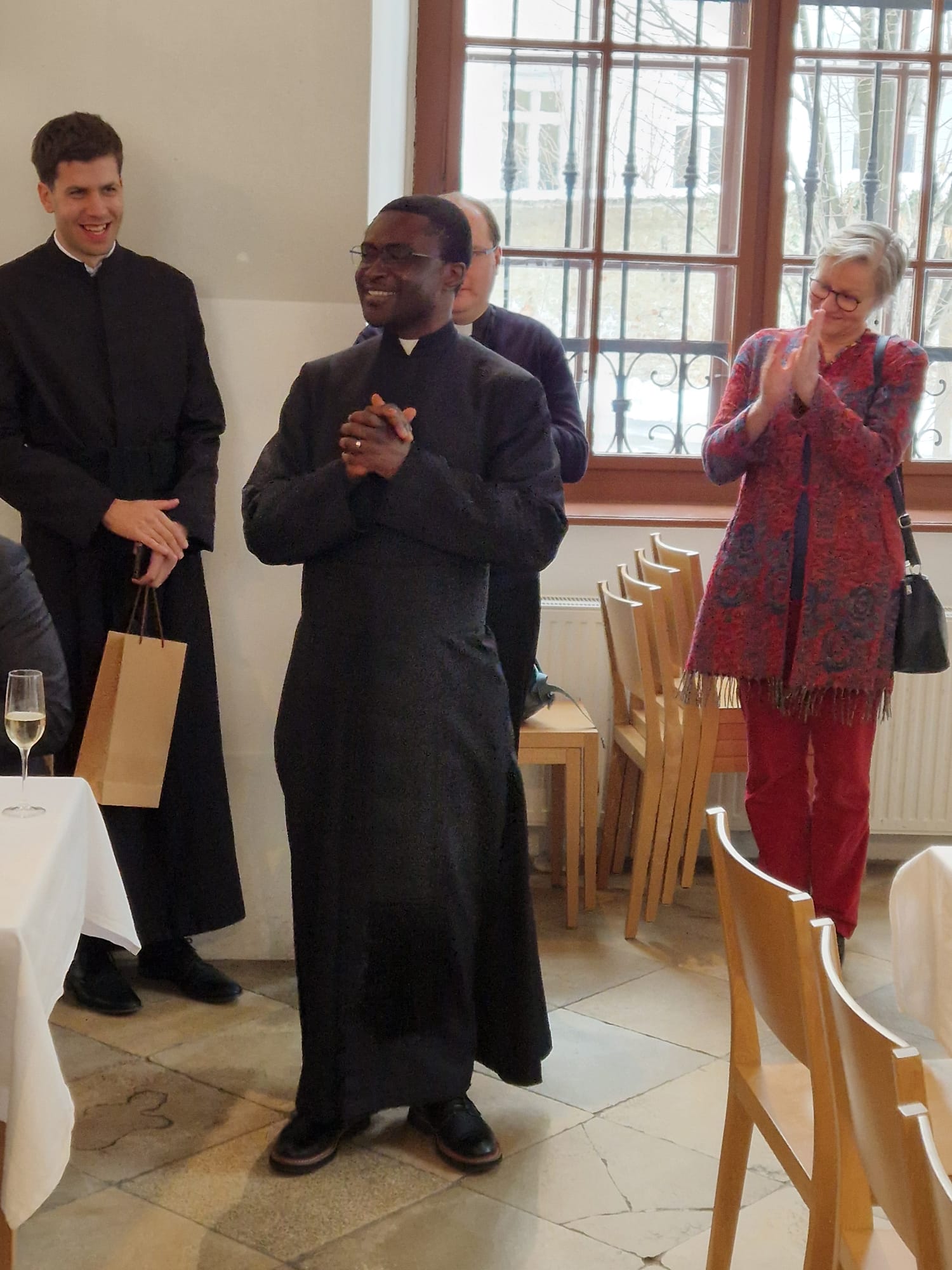 Beim anschließenden Essen im Sommerrefektorium der Piaristen von Maria Treu feierten rund 120 Personen den frischgeweihten Diakon. Mitbrüder, Freunde und Verwandte von Lontum erfreuten die Gäste mit afrikanischer Musik und Tanz. Bischof Pedro beschenkte Lontum mit einer Küchenschürze. Dazu meinte er schmunzelnd: „Ich schenke dir eine besondere Kleidung als Zeichen des Dienens. Man kann sie auch als Priester, Bischof und sogar als Papst noch tragen.“