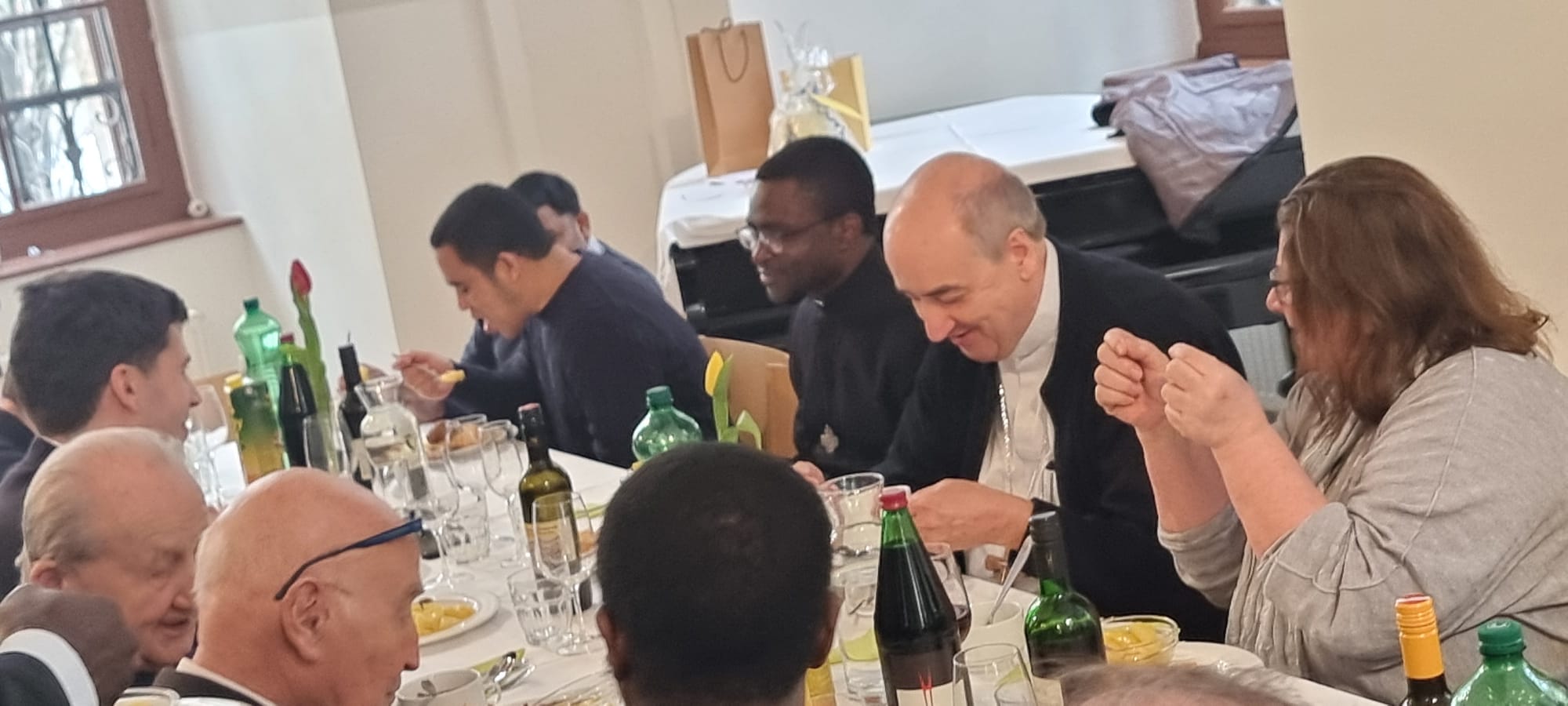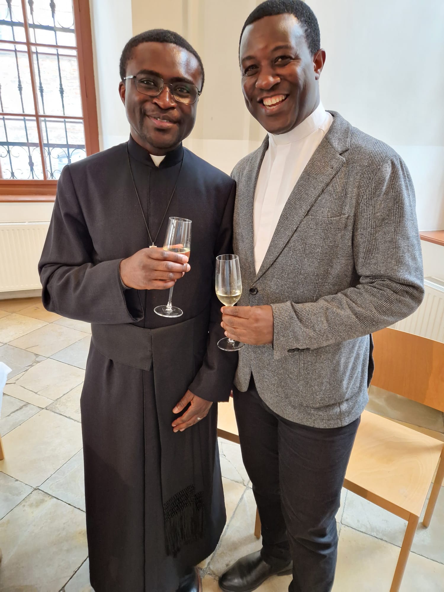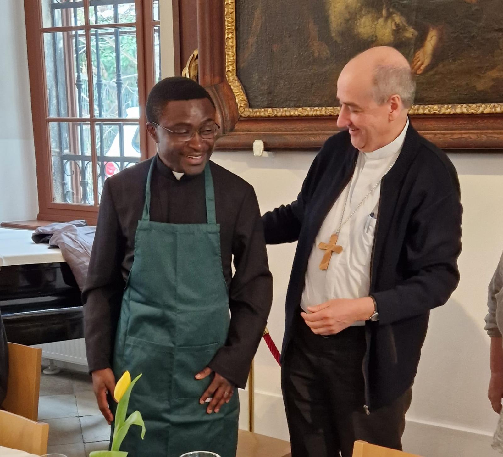 Beim anschließenden Essen im Sommerrefektorium der Piaristen von Maria Treu feierten rund 120 Personen den frischgeweihten Diakon. Mitbrüder, Freunde und Verwandte von Lontum erfreuten die Gäste mit afrikanischer Musik und Tanz. Bischof Pedro beschenkte Lontum mit einer Küchenschürze. Dazu meinte er schmunzelnd: „Ich schenke dir eine besondere Kleidung als Zeichen des Dienens. Man kann sie auch als Priester, Bischof und sogar als Papst noch tragen.“