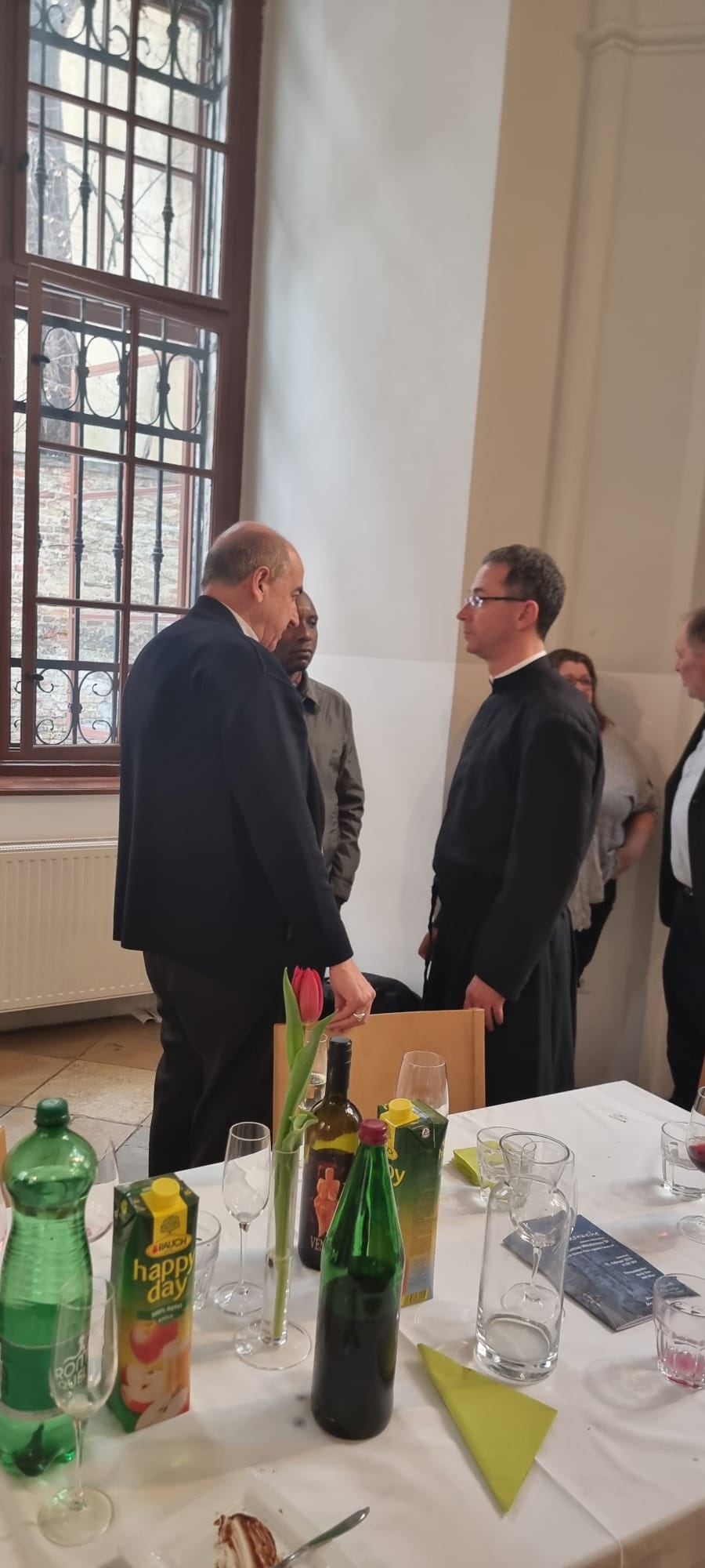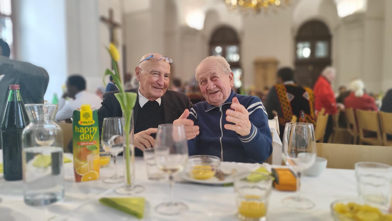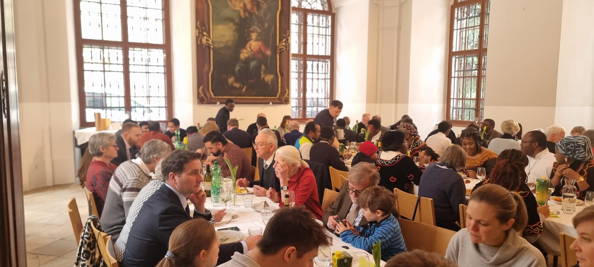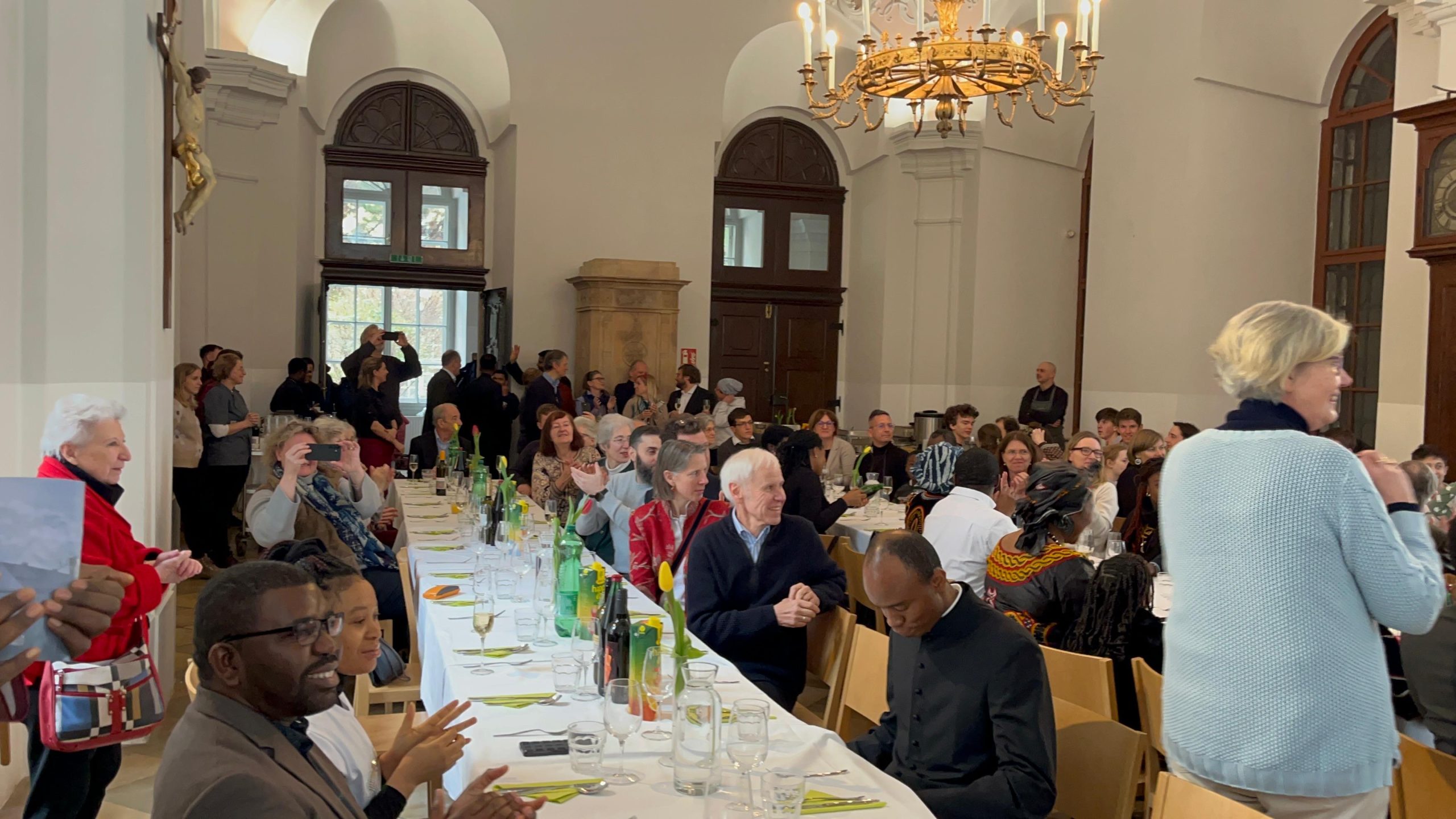 Beim anschließenden Essen im Sommerrefektorium der Piaristen von Maria Treu feierten rund 120 Personen den frischgeweihten Diakon. Mitbrüder, Freunde und Verwandte von Lontum erfreuten die Gäste mit afrikanischer Musik und Tanz. Bischof Pedro beschenkte Lontum mit einer Küchenschürze. Dazu meinte er schmunzelnd: „Ich schenke dir eine besondere Kleidung als Zeichen des Dienens. Man kann sie auch als Priester, Bischof und sogar als Papst noch tragen.“