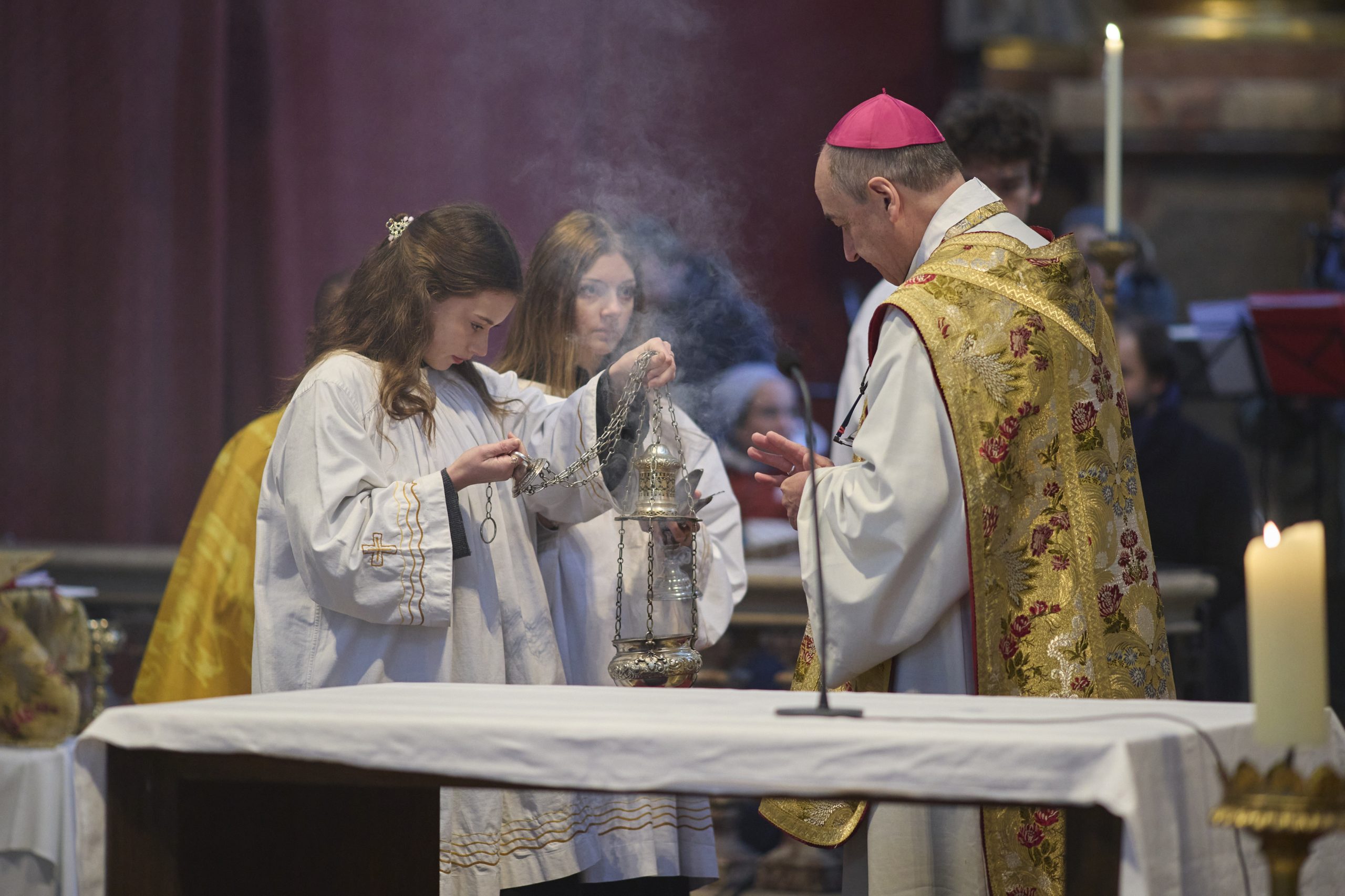 Bischof Pedro, der Lontum schon als Bub kannte, war bis zu seiner Bischofsweihe im Vorjahr Generaloberer der Piaristen. Er drückte gleich zu Beginn seine große Freude darüber aus, dass er seinen Mitbruder Lontum nun persönlich zum Diakon weihen könne. In seiner Predigt stellte er Christus in die Mitte des Diakonatsdienstes. „Lontum empfängt diese Weihe nicht nur, weil er helfen und unterrichten will. Er lässt sich weihen, weil er an Gott glaubt. … In der Mitte steht immer Christus.“ Als weiteres Schlüsselwort nannte er Lehm und bat um das Gebet der Gläubigen für die Diakone und Priester: „Dieser große Schatz, diese Gabe des Dienstes, wird in eine zerbrechliche Hülle gefüllt. Eure Priester sind zerbrechliche Menschen aus Ton. Sie brauchen eure Hilfe, euer Gebet.“ Als dritten wichtigen Aspekt des Diakonats nannte er das Dienen. „Wir müssen darin wachsen, gering zu sein, dienen zu können. Das Priestertum hebt den Diakonat nie auf, der Diakonat ist etwas Ewiges. Er gibt uns die Richtung vor: der Diener zu sein – für die Armen, die Kinder, die Gemeinde, die Verkündigung des Evangeliums.“ Und er erzählte, dass alle jungen Männer, die zur Weihe antreten, eine große unausgesprochene Frage im Herzen hätten: Werde ich mein ganzes Leben lang mit der gleichen Liebe und Begeisterung, die ich heute spüre, meinen Dienst ausüben können? Dabei verwies Bischof Pedro auf P. Pius und P. Rudolf, zwei anwesende 90-jährige Piaristenpatres, und sagte: „Ihre Leidenschaft und Freude ist immer noch dieselbe. Es ist möglich, Lontum! Man kann das ganze Leben diese starke Liebe leben – und sie wird sogar noch wachsen.“